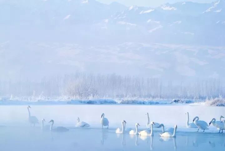 覆盖着薄雪的水面与洁白的天鹅融为一景