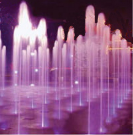特点:水柱因空气渗入在光折射下,亮如玉柱。水柱以垂直向上为主。常用于旱喷,一般用于搭配喷泉中心主水柱。灯光效果好。